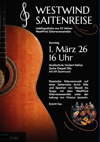 Herzliche Einladung zum Konzert mit dem WestWind Gitarrenensemble unter Leitung von Vinícius Jacomin